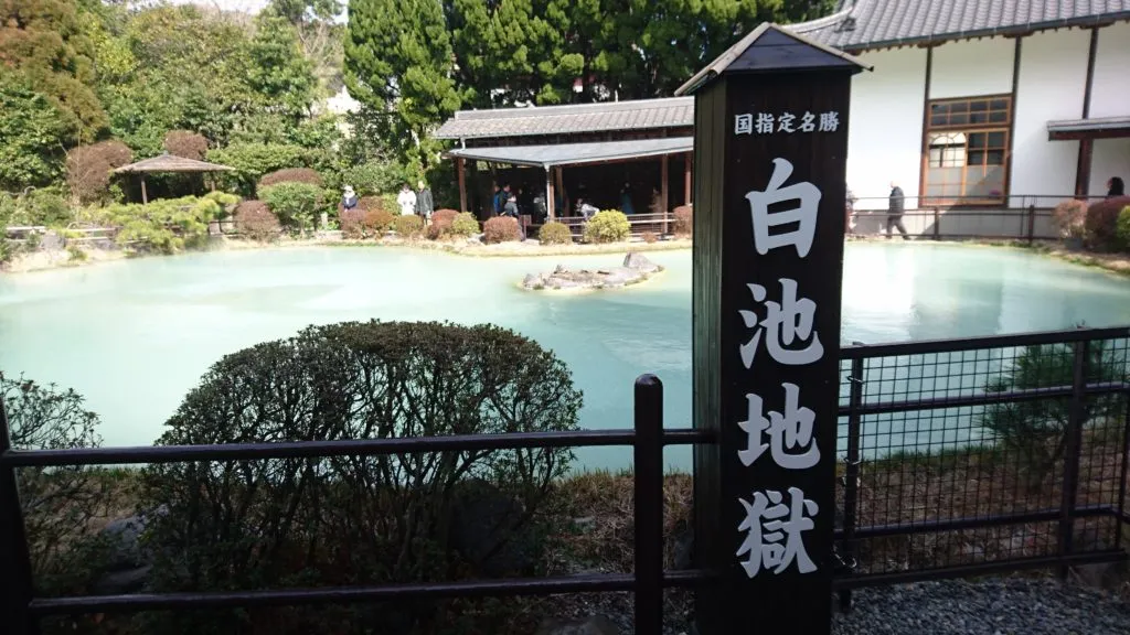 続いて白池地獄。熱帯魚を飼育していました。青白い綺麗な温泉です。