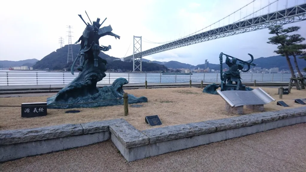 バス停から降りると関門橋が綺麗に見えました。壇ノ浦古戦場跡の像もあります。その反対側には関門トンネル人道入口があります。目的地です。
