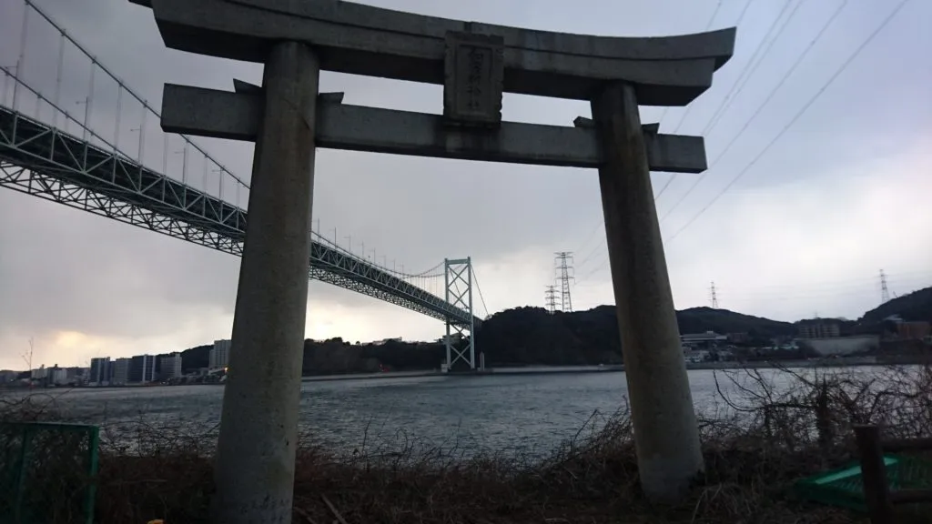 門司側でも地上に上がり、関門橋を望みます。風が強く寒かったです。